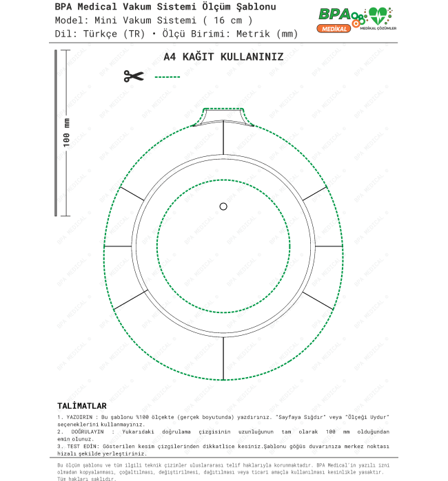 Vacuum Bell ölçü şablonları, CE belgeli tıbbi cihazlara ait teknik ölçülere göre hazırlanmıştır. İlgili cihazların tıbbi cihaz kayıt bilgileri, Sağlık Bakanlığı Ürün Takip Sistemi (ÜTS) üzerinden kullanıcılar tarafından kontrol edilebilir. ÜTS resmî sitesi