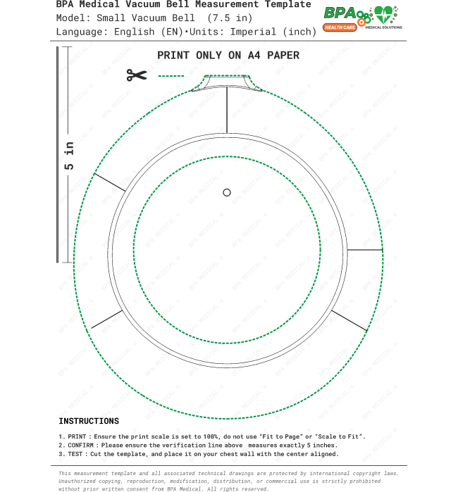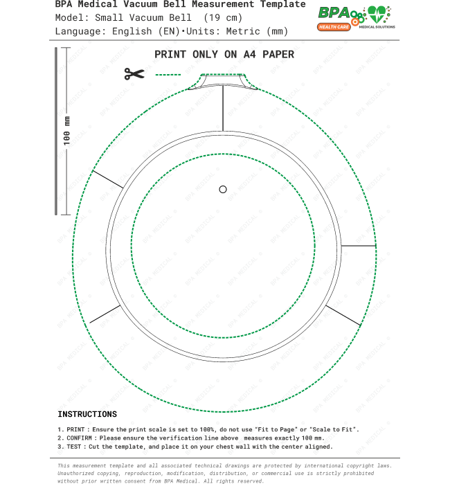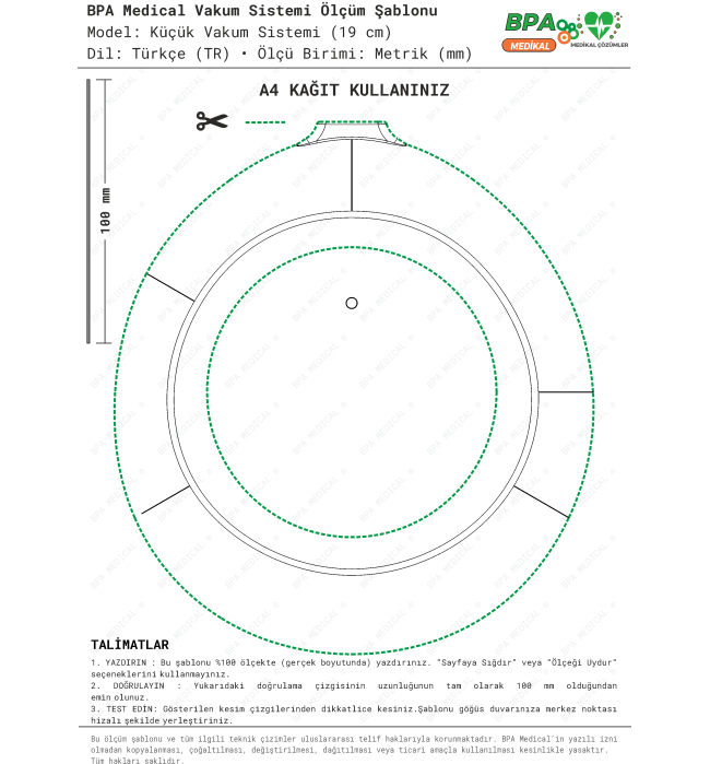 Vacuum Bell ölçü şablonları, CE belgeli tıbbi cihazlara ait teknik ölçülere göre hazırlanmıştır. İlgili cihazların tıbbi cihaz kayıt bilgileri, Sağlık Bakanlığı Ürün Takip Sistemi (ÜTS) üzerinden kullanıcılar tarafından kontrol edilebilir. ÜTS resmî sitesi